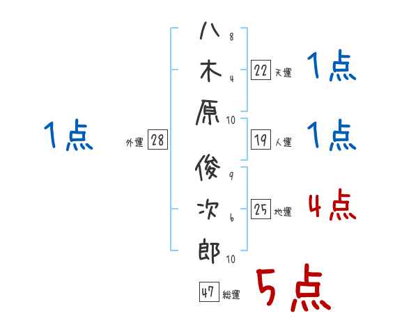 総運![]() | 八木原俊次郎さんの総運は47画の5つ星!実力が開花し発展する円満な人生。財に恵まれる。 あなたの人生を表す1番重要な運勢です。生涯を通じて影響する総合運となり、主に50歳以降の晩年期に影響を及ぼします。 |