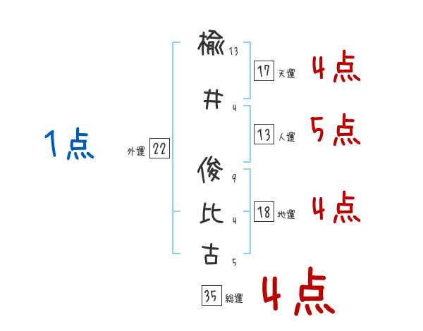 総運![]() | 楡井俊比古さんの総運は35画の4つ星!温厚な性格で感受性が高い。穏和な性格で人望が厚い。 あなたの人生を表す1番重要な運勢です。生涯を通じて影響する総合運となり、主に50歳以降の晩年期に影響を及ぼします。 |