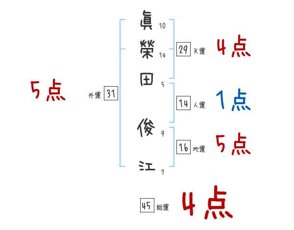 天運![]() | 眞榮田俊江さんの天運は29画の4つ星!完全主義で才能がある。厳格な心の持ち主。 家系が持つ宿命的な運勢を表します。祖先から受け継いだ苗字ですので自分の力が及びません。家柄を象徴します。 |
