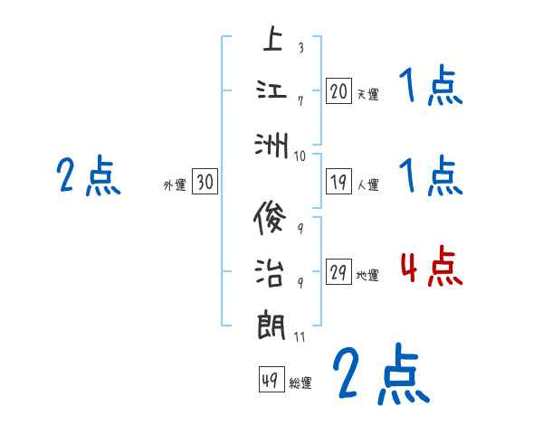 地運![]() | 上江洲俊治朗さんの地運は29画の4つ星!完全主義で才能がある。厳格な心の持ち主。 個性を表す基礎的な運勢です。性格形成や対人関係、行動力など家庭環境に影響されます。主に誕生してから20歳くらいまでの若年期の運勢を表します。 |