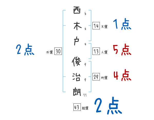 西木戸俊治朗さんの画数の鑑定結果