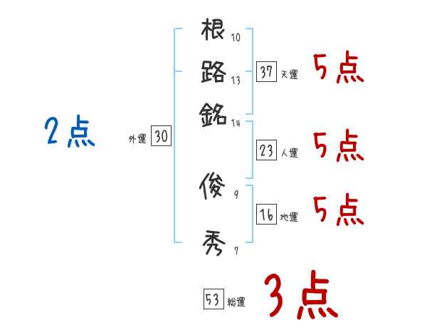 人運![]() | 根路銘俊秀さんの人運は23画の5つ星!想像力に優れ活力がある。一代で成功し名誉を手に入れる。 性格や才能などを表す2番目に重要な運勢です。人間関係や協調性、社会的な成功に影響します。主に20歳から50歳ぐらいまでの中年期の運勢を表します。 |