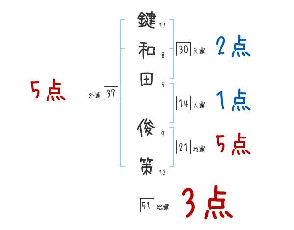 外運![]() | 鍵和田俊策さんの外運は37画の5つ星!努力家で順応性に優れる。現実的な考え方ができ忠実に物事をこなす。 生活面を象徴する運勢です。外部から受ける影響力を表し、結婚運、家庭運や職場、環境への順応性を表します。 |