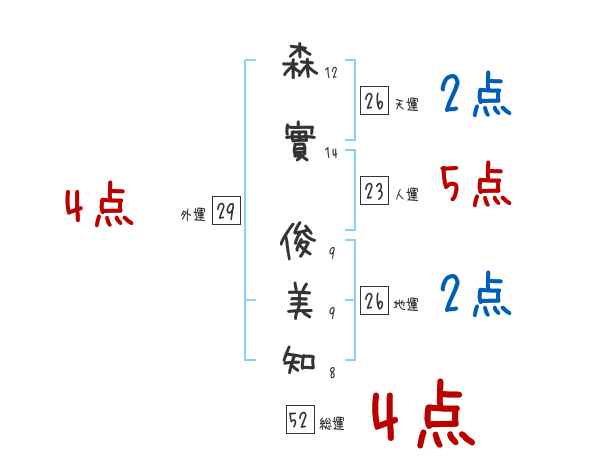 外運![]() | 森實俊美知さんの外運は29画の4つ星!完全主義で才能がある。厳格な心の持ち主。 生活面を象徴する運勢です。外部から受ける影響力を表し、結婚運、家庭運や職場、環境への順応性を表します。 |