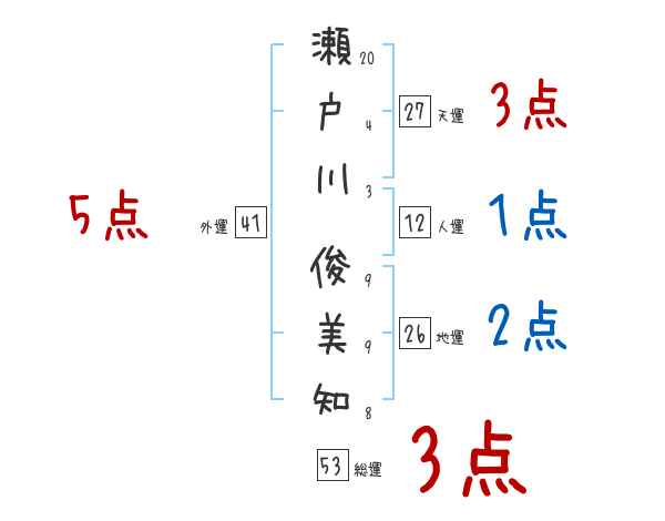 総運![]() | 瀬戸川俊美知さんの総運は53画の3つ星!やや見栄っ張りで虚栄心がある。散財に注意。 あなたの人生を表す1番重要な運勢です。生涯を通じて影響する総合運となり、主に50歳以降の晩年期に影響を及ぼします。 |
