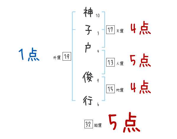 総運![]() | 神子戸俊行さんの総運は32画の5つ星!柔軟性があり成功する。チャンスが多く金運が良い。 あなたの人生を表す1番重要な運勢です。生涯を通じて影響する総合運となり、主に50歳以降の晩年期に影響を及ぼします。 |