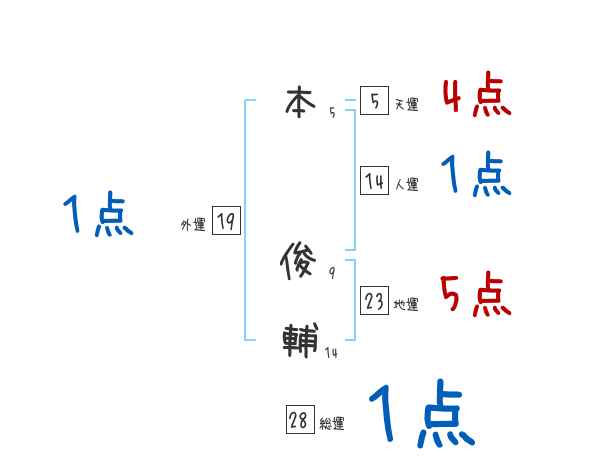 総運![]() | 本俊輔さんの総運は28画の1つ星!家庭環境に注意。スポーツで活躍できる能力があるかも。 あなたの人生を表す1番重要な運勢です。生涯を通じて影響する総合運となり、主に50歳以降の晩年期に影響を及ぼします。 |