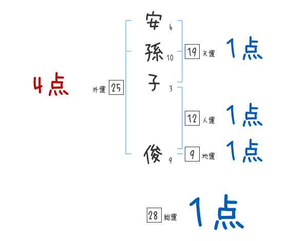天運![]() | 安孫子俊さんの天運は19画の1つ星!優れた才能を持ちますが、協調性が足りないことも。周りの人と協力する事を意識しましょう。 家系が持つ宿命的な運勢を表します。祖先から受け継いだ苗字ですので自分の力が及びません。家柄を象徴します。 |