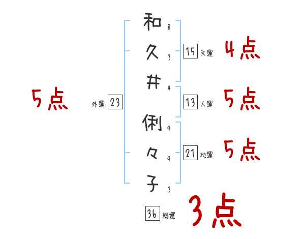 総運![]() | 和久井俐々子さんの総運は36画の3つ星!先見性が豊かです。多少神経質で苦労することも。 あなたの人生を表す1番重要な運勢です。生涯を通じて影響する総合運となり、主に50歳以降の晩年期に影響を及ぼします。 |