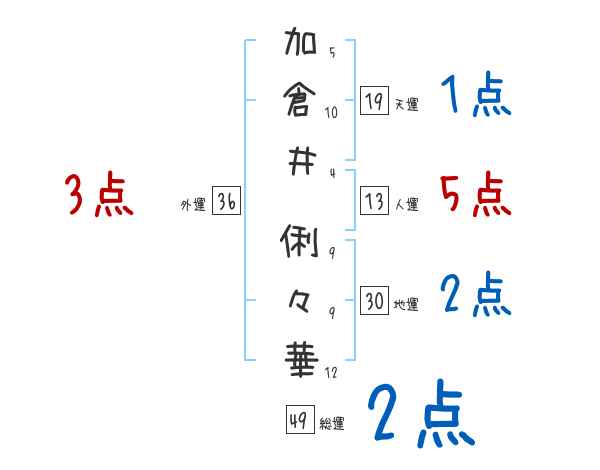 総運![]() | 加倉井俐々華さんの総運は49画の2つ星!不安定な性格で明暗がある人生。周りの人には支援されやすい。 あなたの人生を表す1番重要な運勢です。生涯を通じて影響する総合運となり、主に50歳以降の晩年期に影響を及ぼします。 |
