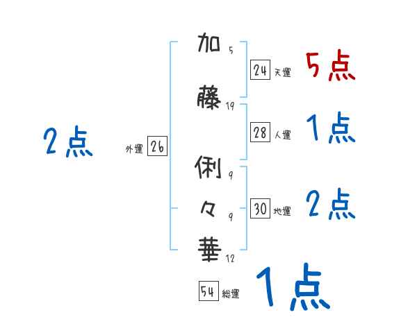 総運![]() | 加藤俐々華さんの総運は54画の1つ星!トラブルが多いかも。周りをよく見て協調して過ごしましょう。 あなたの人生を表す1番重要な運勢です。生涯を通じて影響する総合運となり、主に50歳以降の晩年期に影響を及ぼします。 |
