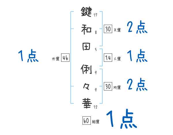 総運![]() | 鍵和田俐々華さんの総運は60画の1つ星!悲観的で迷いやすい。波乱が多く損をしないように。 あなたの人生を表す1番重要な運勢です。生涯を通じて影響する総合運となり、主に50歳以降の晩年期に影響を及ぼします。 |