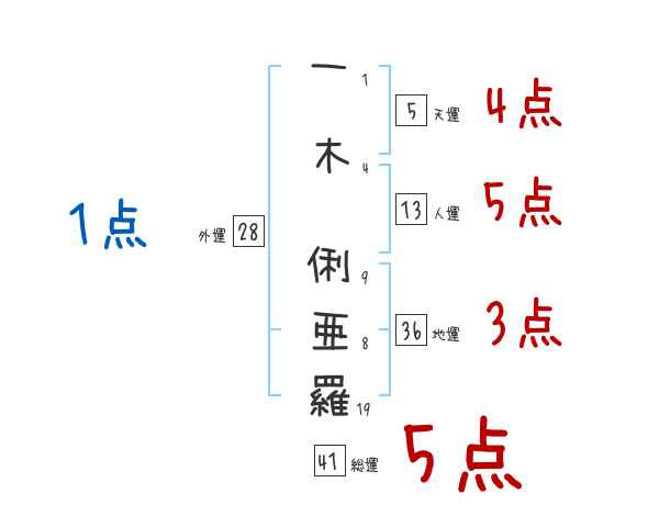 天運![]() | 一木俐亜羅さんの天運は5画の4つ星!健康で安泰。協調性に優れ、財産に恵まれる。 家系が持つ宿命的な運勢を表します。祖先から受け継いだ苗字ですので自分の力が及びません。家柄を象徴します。 |