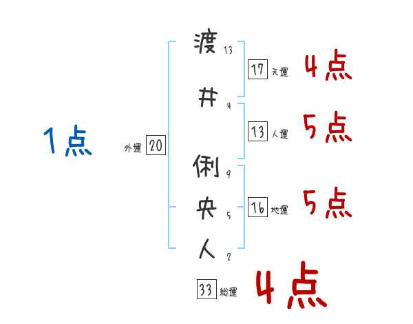 天運![]() | 渡井俐央人さんの天運は17画の4つ星!積極的な行動力。地位を気づき財産を手に入れる。純粋な心と直感力。 家系が持つ宿命的な運勢を表します。祖先から受け継いだ苗字ですので自分の力が及びません。家柄を象徴します。 |