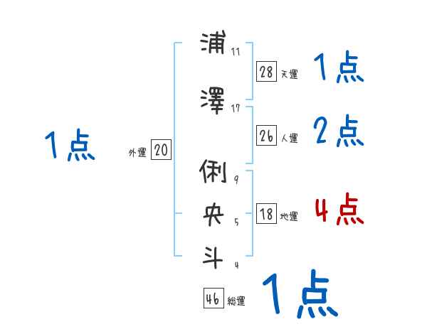 天運![]() | 浦澤俐央斗さんの天運は28画の1つ星!家庭環境に注意。スポーツで活躍できる能力があるかも。 家系が持つ宿命的な運勢を表します。祖先から受け継いだ苗字ですので自分の力が及びません。家柄を象徴します。 |