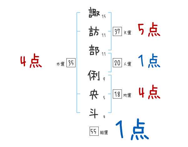 外運![]() | 諏訪部俐央斗さんの外運は35画の4つ星!温厚な性格で感受性が高い。穏和な性格で人望が厚い。 生活面を象徴する運勢です。外部から受ける影響力を表し、結婚運、家庭運や職場、環境への順応性を表します。 |