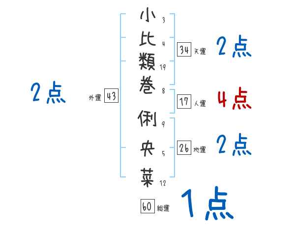 天運![]() | 小比類巻俐央菜さんの天運は34画の2つ星!独創性に優れるが、自尊心が強く災難に注意しましょう。 家系が持つ宿命的な運勢を表します。祖先から受け継いだ苗字ですので自分の力が及びません。家柄を象徴します。 |