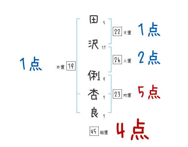 天運![]() | 田沢俐杏良さんの天運は22画の1つ星!努力することが苦手ないっぽう手先が器用。芸術性にも優れる。 家系が持つ宿命的な運勢を表します。祖先から受け継いだ苗字ですので自分の力が及びません。家柄を象徴します。 |