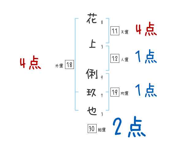 天運![]() | 花上俐玖也さんの天運は11画の4つ星!着実に富や地位を得る幸運な人生。 家系が持つ宿命的な運勢を表します。祖先から受け継いだ苗字ですので自分の力が及びません。家柄を象徴します。 |