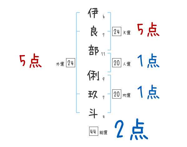 総運![]() | 伊良部俐玖斗さんの総運は44画の2つ星!誠実で慎重な性格。物事を考えすぎないように注意しましょう。 あなたの人生を表す1番重要な運勢です。生涯を通じて影響する総合運となり、主に50歳以降の晩年期に影響を及ぼします。 |