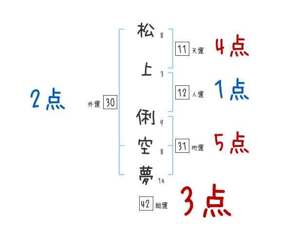 天運![]() | 松上俐空夢さんの天運は11画の4つ星!着実に富や地位を得る幸運な人生。 家系が持つ宿命的な運勢を表します。祖先から受け継いだ苗字ですので自分の力が及びません。家柄を象徴します。 |