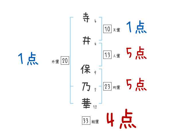 人運![]() | 寺井保乃華さんの人運は13画の5つ星!才能に恵まれ人気がある。名声を手に入れる。円満な人生。 性格や才能などを表す2番目に重要な運勢です。人間関係や協調性、社会的な成功に影響します。主に20歳から50歳ぐらいまでの中年期の運勢を表します。 |