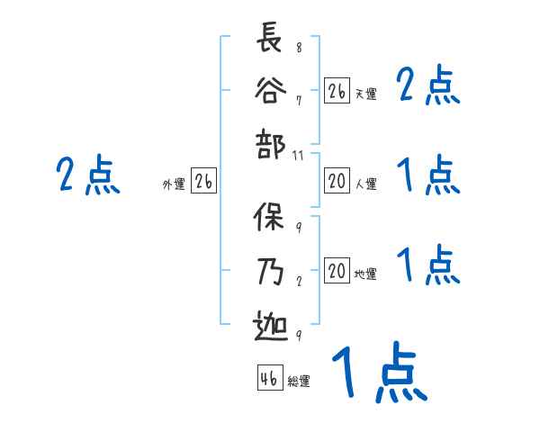 天運![]() | 長谷部保乃迦さんの天運は26画の2つ星!波瀾万丈かも。信頼できる人を大事にしましょう。 家系が持つ宿命的な運勢を表します。祖先から受け継いだ苗字ですので自分の力が及びません。家柄を象徴します。 |