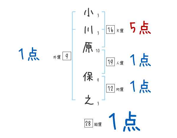 総運![]() | 小川原保之さんの総運は28画の1つ星!家庭環境に注意。スポーツで活躍できる能力があるかも。 あなたの人生を表す1番重要な運勢です。生涯を通じて影響する総合運となり、主に50歳以降の晩年期に影響を及ぼします。 |