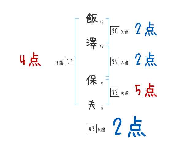 外運![]() | 飯澤保夫さんの外運は17画の4つ星!積極的な行動力。地位を気づき財産を手に入れる。純粋な心と直感力。 生活面を象徴する運勢です。外部から受ける影響力を表し、結婚運、家庭運や職場、環境への順応性を表します。 |