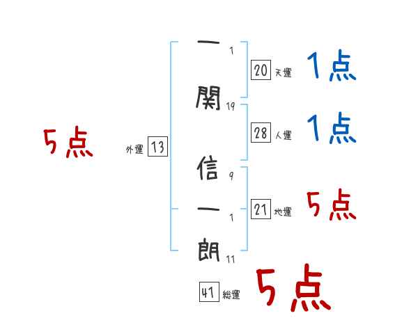 総運![]() | 一関信一朗さんの総運は41画の5つ星!大志を抱き、目標に向かって実力を発揮し達成する。温和な性格。 あなたの人生を表す1番重要な運勢です。生涯を通じて影響する総合運となり、主に50歳以降の晩年期に影響を及ぼします。 |