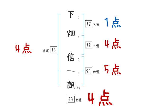外運![]() | 下畑信一朗さんの外運は15画の4つ星!人徳があり出世する。順調に物事を進め円満な人生。 生活面を象徴する運勢です。外部から受ける影響力を表し、結婚運、家庭運や職場、環境への順応性を表します。 |