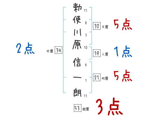 天運![]() | 勅使川原信一朗さんの天運は32画の5つ星!柔軟性があり成功する。チャンスが多く金運が良い。 家系が持つ宿命的な運勢を表します。祖先から受け継いだ苗字ですので自分の力が及びません。家柄を象徴します。 |