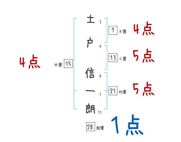 外運![]() | 土戸信一朗さんの外運は15画の4つ星!人徳があり出世する。順調に物事を進め円満な人生。 生活面を象徴する運勢です。外部から受ける影響力を表し、結婚運、家庭運や職場、環境への順応性を表します。 |