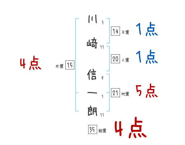 外運![]() | 川﨑信一朗さんの外運は15画の4つ星!人徳があり出世する。順調に物事を進め円満な人生。 生活面を象徴する運勢です。外部から受ける影響力を表し、結婚運、家庭運や職場、環境への順応性を表します。 |