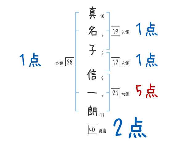 地運![]() | 真名子信一朗さんの地運は21画の5つ星!統率力がある。独立し成功する。名誉を手に入れる。 個性を表す基礎的な運勢です。性格形成や対人関係、行動力など家庭環境に影響されます。主に誕生してから20歳くらいまでの若年期の運勢を表します。 |