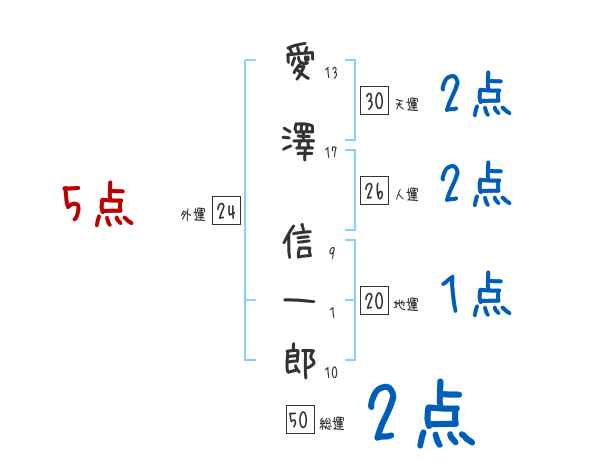 天運![]() | 愛澤信一郎さんの天運は30画の2つ星!浮き沈みの激しさに注意しましょう。 家系が持つ宿命的な運勢を表します。祖先から受け継いだ苗字ですので自分の力が及びません。家柄を象徴します。 |