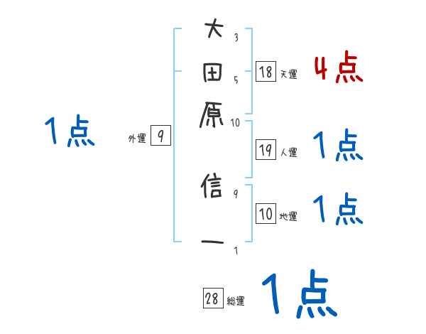 総運![]() | 大田原信一さんの総運は28画の1つ星!家庭環境に注意。スポーツで活躍できる能力があるかも。 あなたの人生を表す1番重要な運勢です。生涯を通じて影響する総合運となり、主に50歳以降の晩年期に影響を及ぼします。 |