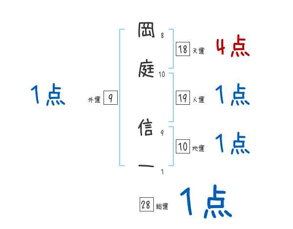 総運![]() | 岡庭信一さんの総運は28画の1つ星!家庭環境に注意。スポーツで活躍できる能力があるかも。 あなたの人生を表す1番重要な運勢です。生涯を通じて影響する総合運となり、主に50歳以降の晩年期に影響を及ぼします。 |