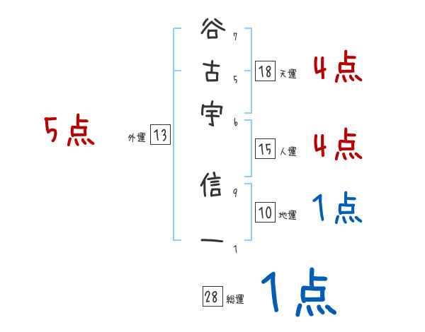 総運![]() | 谷古宇信一さんの総運は28画の1つ星!家庭環境に注意。スポーツで活躍できる能力があるかも。 あなたの人生を表す1番重要な運勢です。生涯を通じて影響する総合運となり、主に50歳以降の晩年期に影響を及ぼします。 |