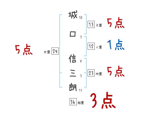 外運![]() | 城口信三朗さんの外運は24画の5つ星!家庭運が良く順調な人生。金運にも恵まれる。 生活面を象徴する運勢です。外部から受ける影響力を表し、結婚運、家庭運や職場、環境への順応性を表します。 |