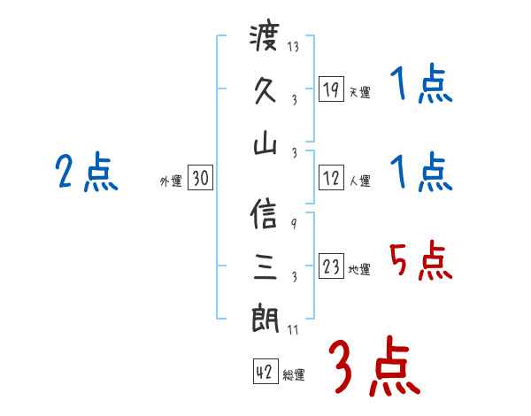 外運![]() | 渡久山信三朗さんの外運は30画の2つ星!浮き沈みの激しさに注意しましょう。 生活面を象徴する運勢です。外部から受ける影響力を表し、結婚運、家庭運や職場、環境への順応性を表します。 |
