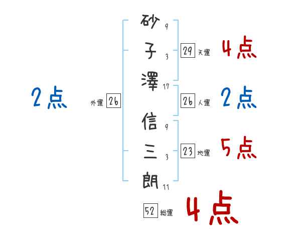 外運![]() | 砂子澤信三朗さんの外運は26画の2つ星!波瀾万丈かも。信頼できる人を大事にしましょう。 生活面を象徴する運勢です。外部から受ける影響力を表し、結婚運、家庭運や職場、環境への順応性を表します。 |