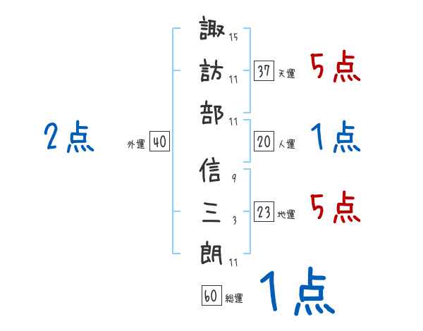 天運![]() | 諏訪部信三朗さんの天運は37画の5つ星!努力家で順応性に優れる。現実的な考え方ができ忠実に物事をこなす。 家系が持つ宿命的な運勢を表します。祖先から受け継いだ苗字ですので自分の力が及びません。家柄を象徴します。 |