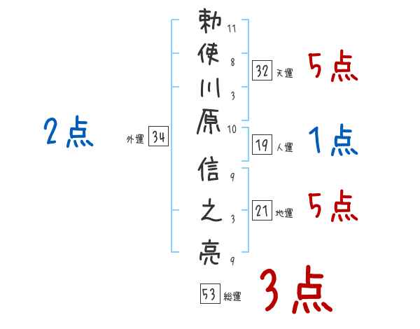天運![]() | 勅使川原信之亮さんの天運は32画の5つ星!柔軟性があり成功する。チャンスが多く金運が良い。 家系が持つ宿命的な運勢を表します。祖先から受け継いだ苗字ですので自分の力が及びません。家柄を象徴します。 |