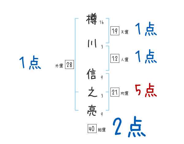 地運![]() | 樽川信之亮さんの地運は21画の5つ星!統率力がある。独立し成功する。名誉を手に入れる。 個性を表す基礎的な運勢です。性格形成や対人関係、行動力など家庭環境に影響されます。主に誕生してから20歳くらいまでの若年期の運勢を表します。 |