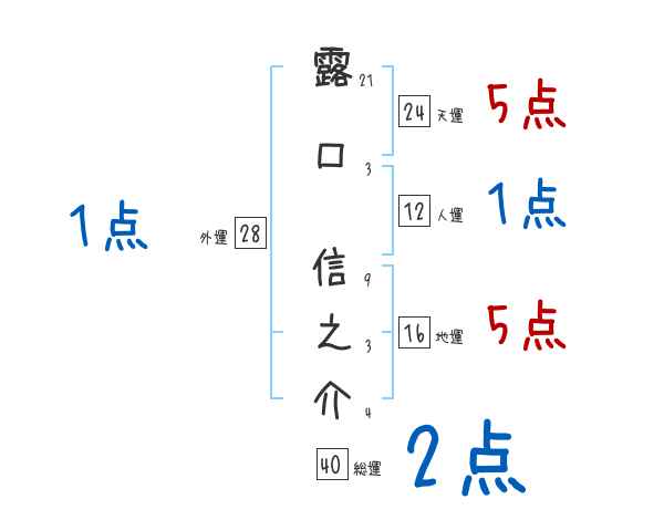 外運![]() | 露口信之介さんの外運は28画の1つ星!家庭環境に注意。スポーツで活躍できる能力があるかも。 生活面を象徴する運勢です。外部から受ける影響力を表し、結婚運、家庭運や職場、環境への順応性を表します。 |