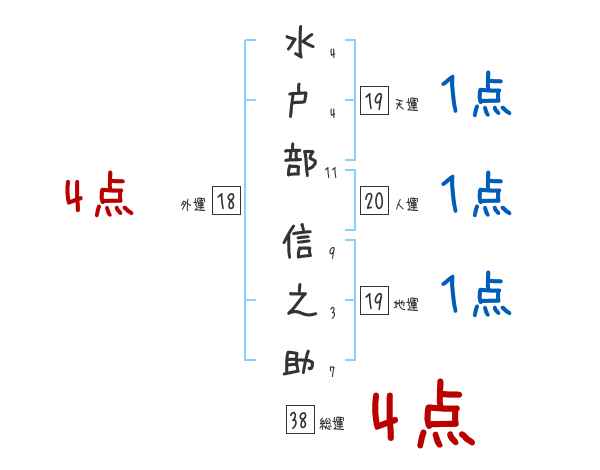 外運![]() | 水戸部信之助さんの外運は18画の4つ星!情熱的で剛気。忍耐力があり信頼される。 生活面を象徴する運勢です。外部から受ける影響力を表し、結婚運、家庭運や職場、環境への順応性を表します。 |