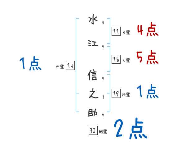 天運![]() | 水江信之助さんの天運は11画の4つ星!着実に富や地位を得る幸運な人生。 家系が持つ宿命的な運勢を表します。祖先から受け継いだ苗字ですので自分の力が及びません。家柄を象徴します。 |
