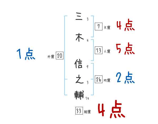 天運![]() | 三木信之輔さんの天運は7画の4つ星!強い意志や信念を持ち独立心が強い。自立する。 家系が持つ宿命的な運勢を表します。祖先から受け継いだ苗字ですので自分の力が及びません。家柄を象徴します。 |