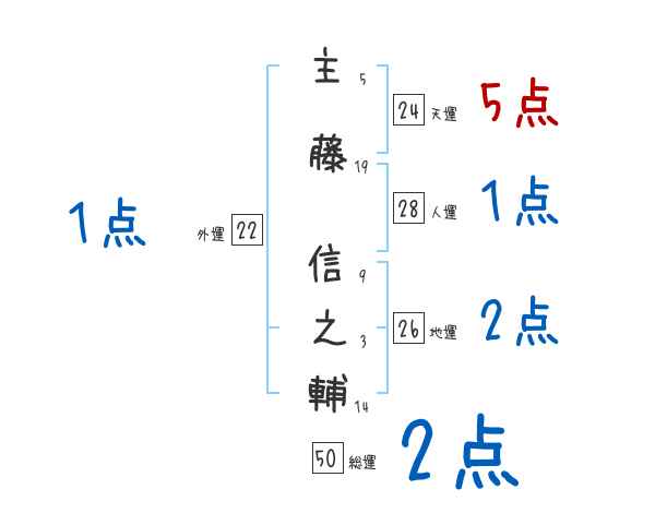 天運![]() | 主藤信之輔さんの天運は24画の5つ星!家庭運が良く順調な人生。金運にも恵まれる。 家系が持つ宿命的な運勢を表します。祖先から受け継いだ苗字ですので自分の力が及びません。家柄を象徴します。 |